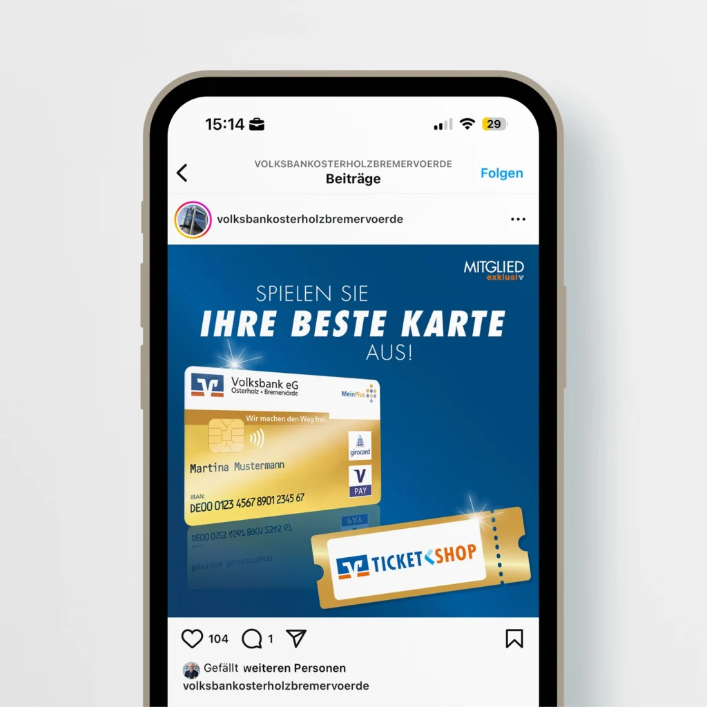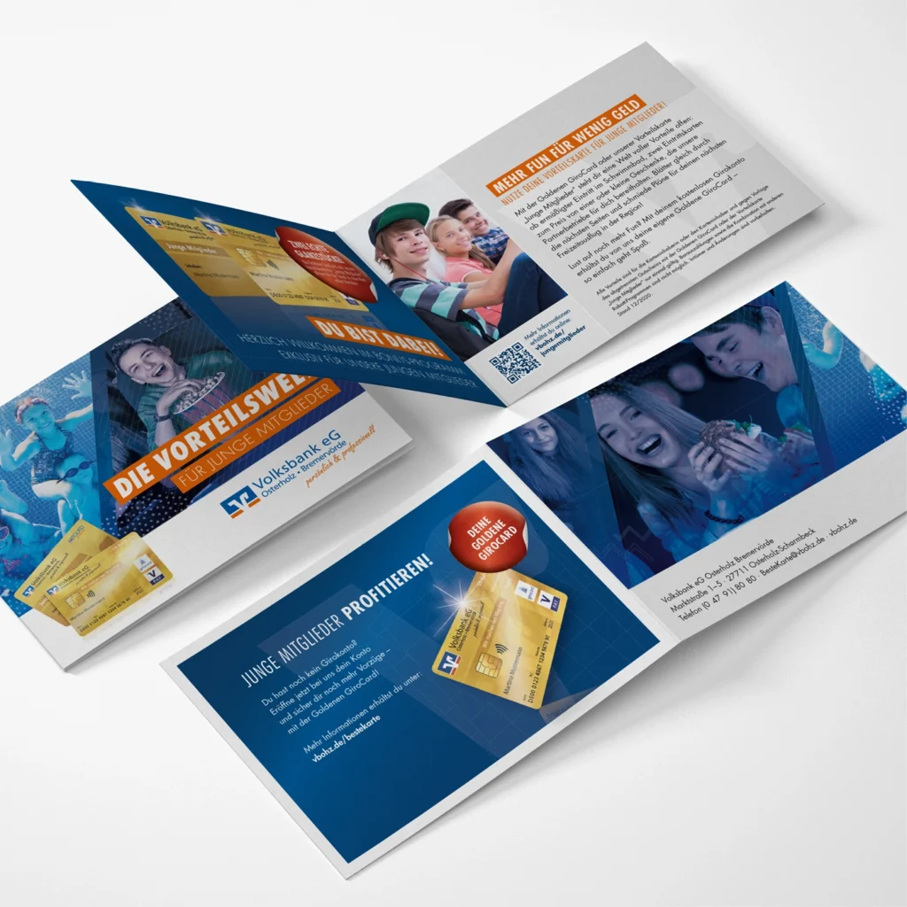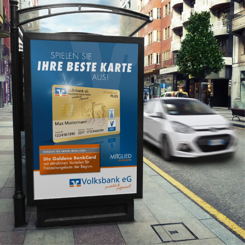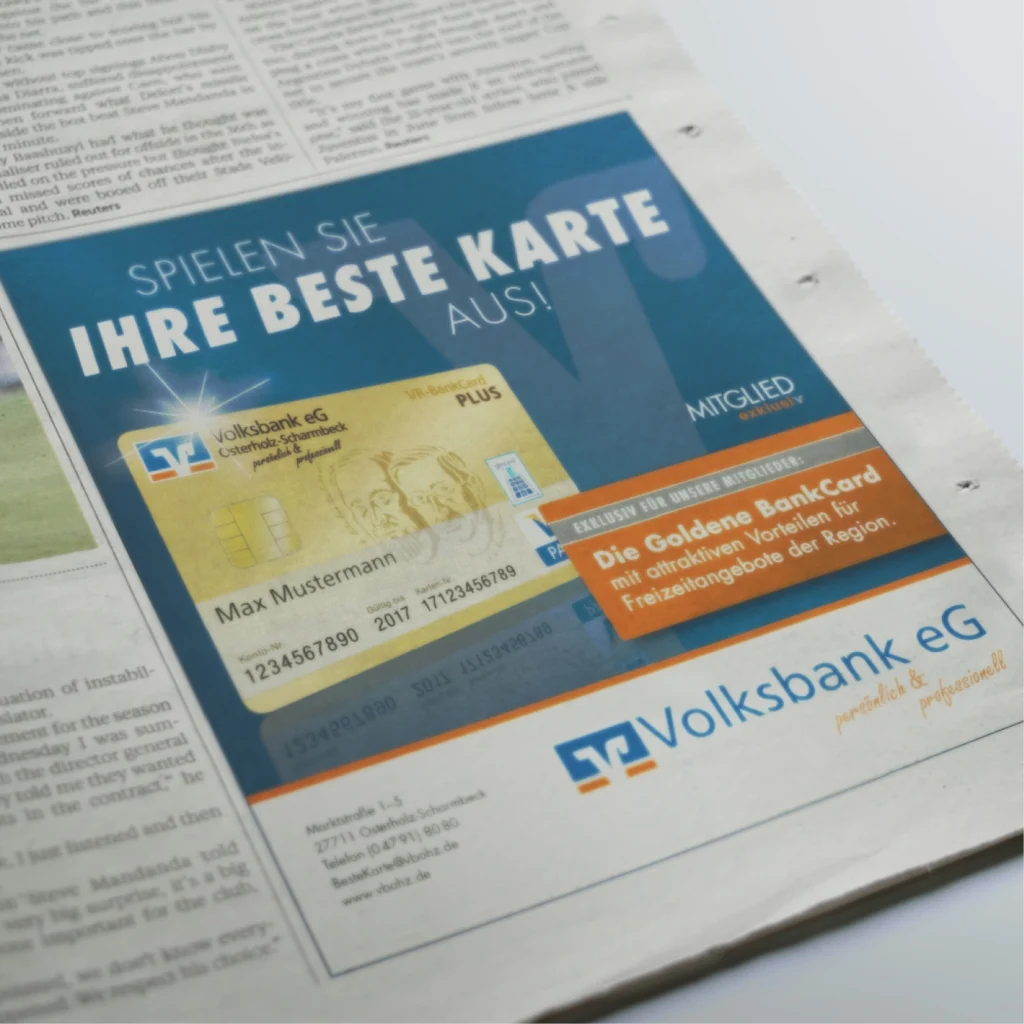 Für die Volksbank eG Osterholz Bremervörde konzipieren und realisieren wir die Kommunikation rund um die exklusive goldene girocard – eine Debitkarte, die weit über die üblichen Funktionen einer Bankkarte hinausgeht. Karteninhaber profitieren von attraktiven Rabatten bei regionalen Partnerunternehmen sowie von exklusiven Premium-Angeboten in ganz Deutschland, darunter Vergünstigungen in Gastronomie, Freizeit und Einzelhandel. Die „MeinPlus“-App bietet eine benutzerfreundliche Übersicht aller Vergünstigungen in der Nähe, die direkt über das Smartphone abgerufen werden können.