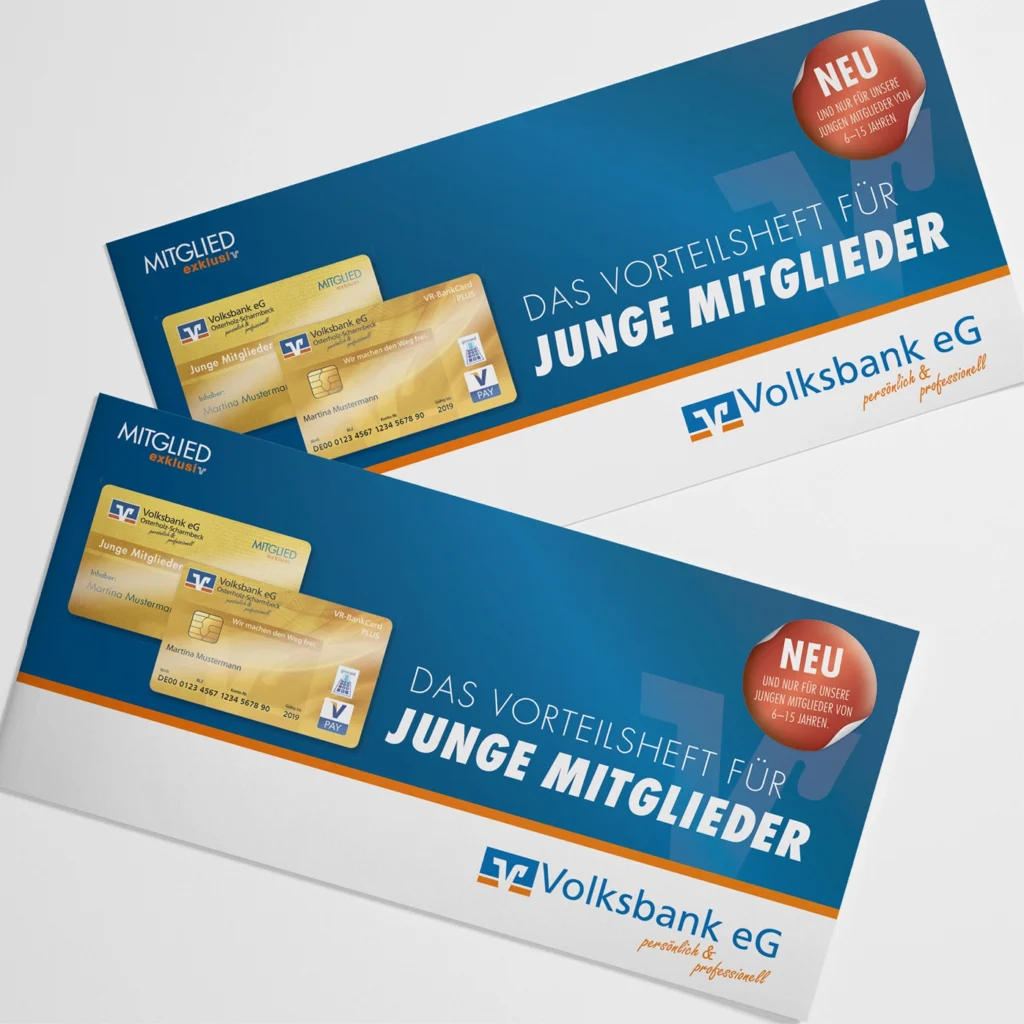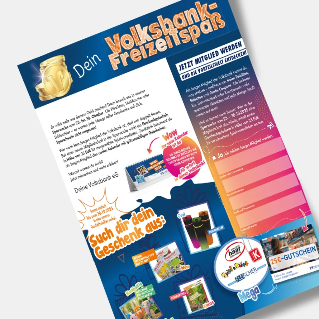 Wir haben eine crossmediale Kommunikationsstrategie entwickelt, die zielgruppenspezifische Kampagnen und Aktionen umfasst. Ein einheitliches Layout sorgt für einen konsistenten Markenauftritt, steigert den Wiedererkennungswert und stärkt die langfristige Präsenz der Marke im Bewusstsein der Zielgruppe. Unsere Leistungen umfassen die Umsetzung und Koordination von Kampagnen zur Mitgliedergewinnung, zur Ansprache jüngerer Zielgruppen, Sonderaktionen wie die Kooperation mit dem Nordwest Ticketshop, das Anteilskonzept sowie die regelmäßige Aktualisierung des Couponhefts. Durch einen ganzheitlichen Ansatz, der die Kanäle Digital, Print und Filiale verbindet, haben wir ein harmonisches Design entwickelt, das die Gestaltungselemente der Volksbank nahtlos mit der genossenschaftlichen Gemeinschaftswerbung verbindet.
