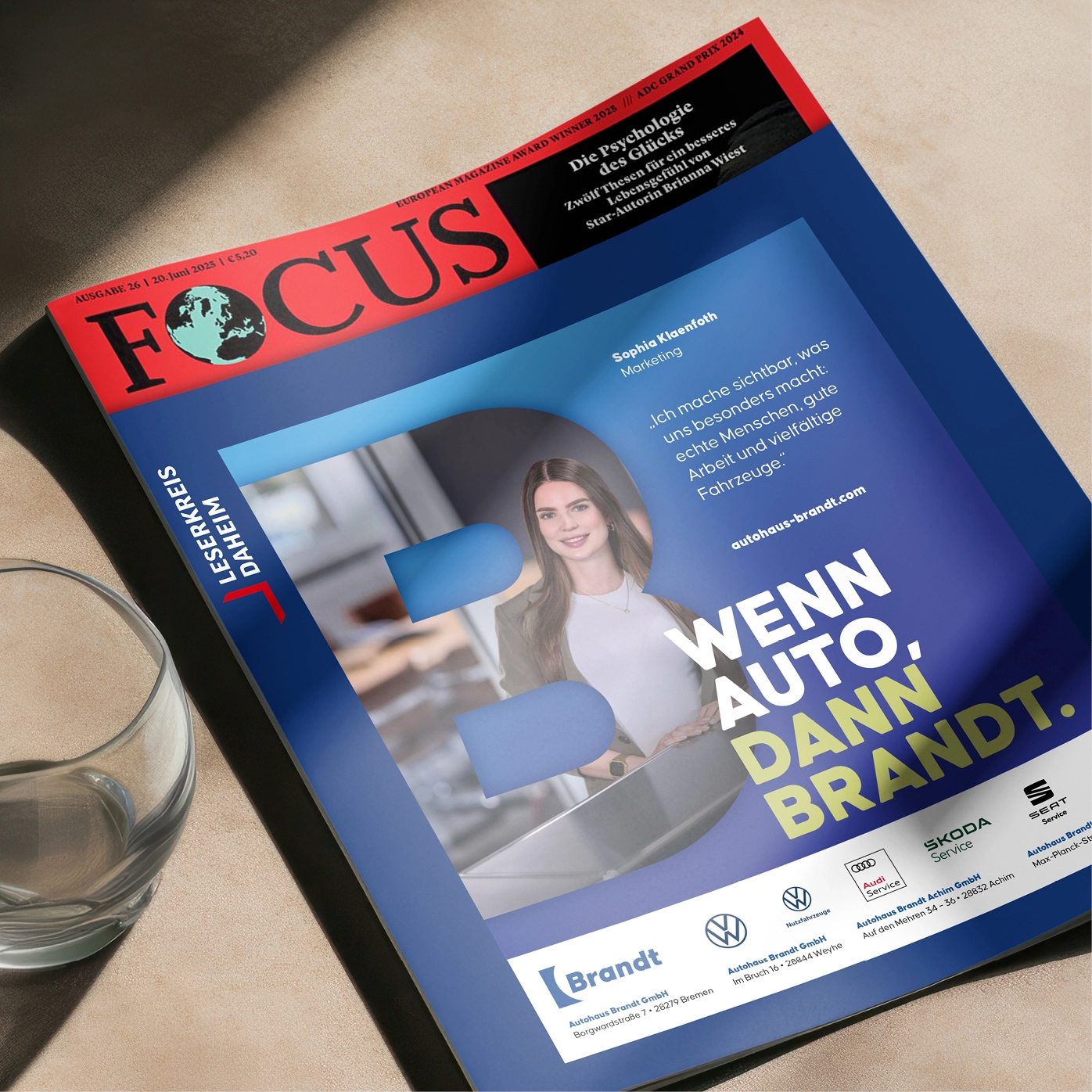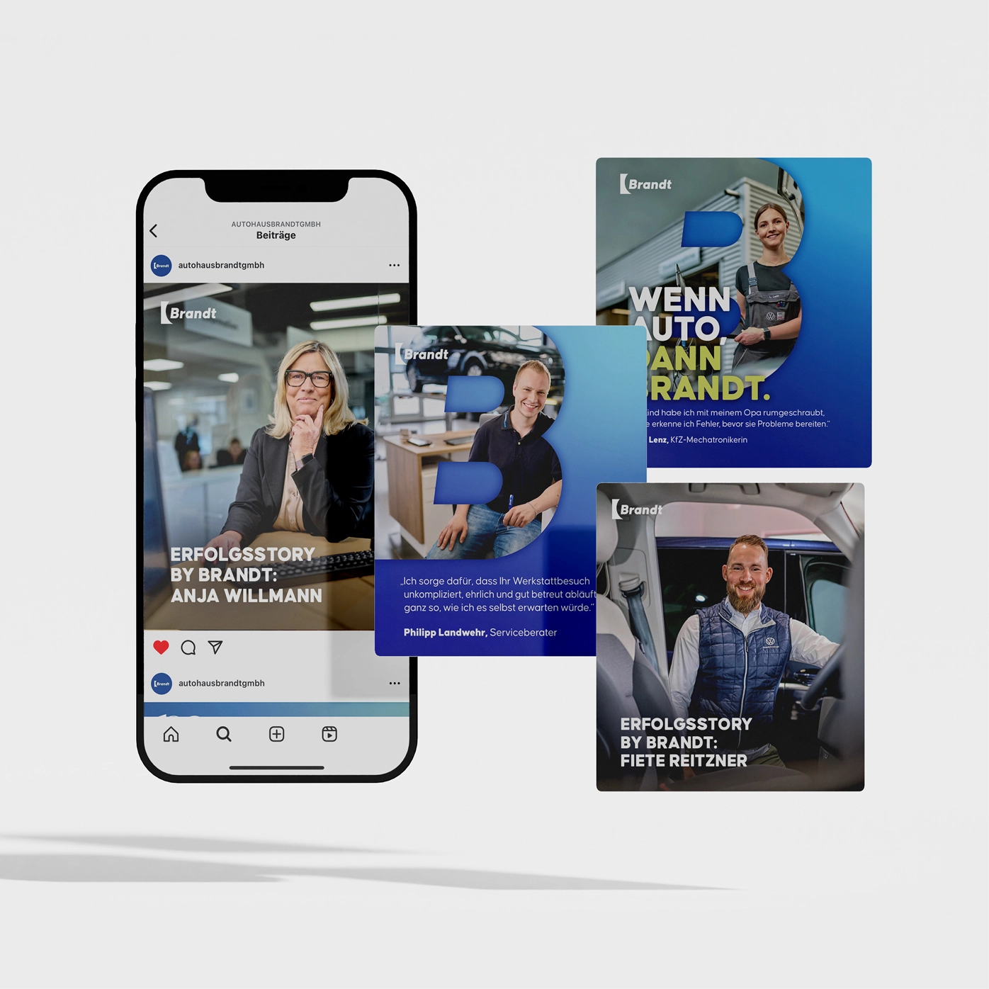 Seit 2024 zeigt sich Brandt mit einem noch mutigeren und frischeren Auftritt. Neben den etablierten Social-Media-Aktivitäten setzen wir eine Vielzahl weiterer Projekte um: flächendeckende Teamkampagnen in Print, online und im Stadtbild, aufmerksamkeitsstarke Aktionskampagnen für verschiedene Geschäftsbereiche – vom Großkundensegment über Nutzfahrzeuge bis hin zu Neu- und Gebrauchtwagen –, kreative Jubiläumskonzepte, Fahrzeugbeklebungen, Recruiting-Maßnahmen und vieles mehr.