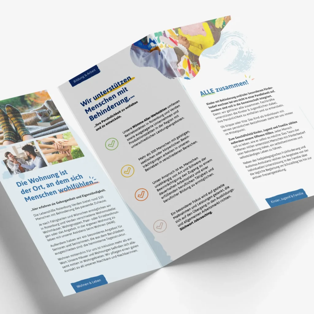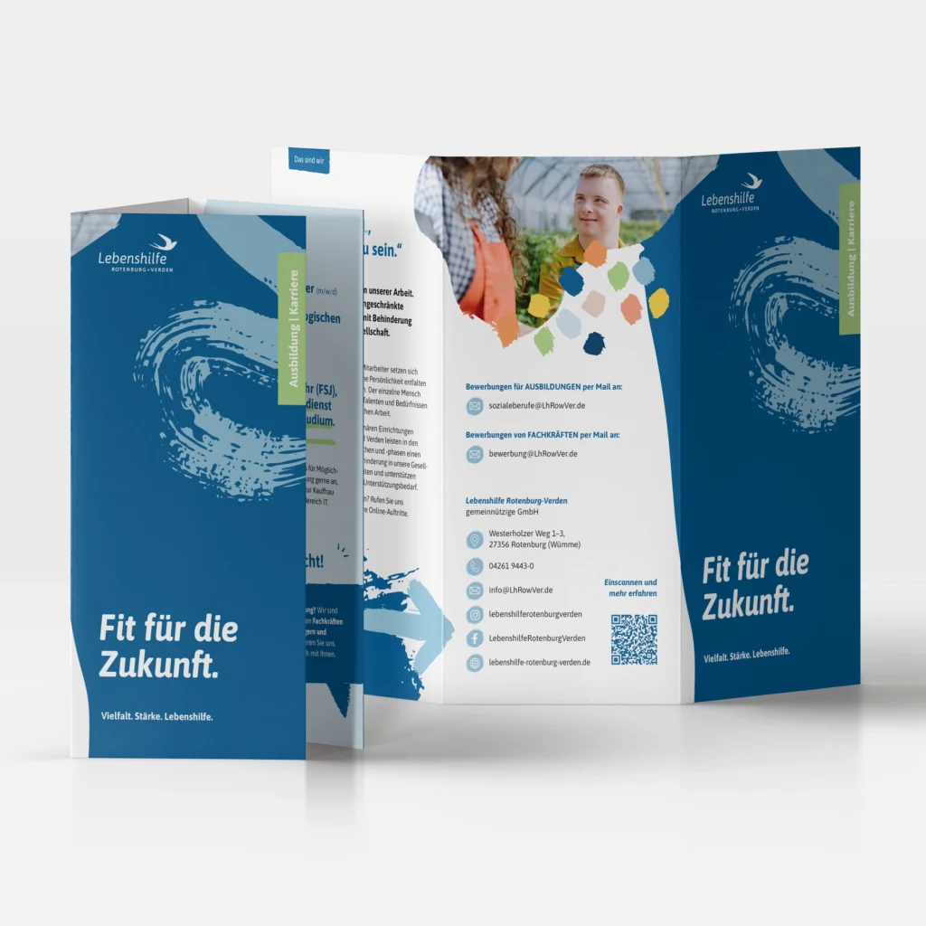 Das Ergebnis ist ein konsistentes Erscheinungsbild, das die Arbeit der Lebenshilfe Rotenburg-Verden auf moderne Weise präsentiert. Durch die enge Zusammenarbeit mit den Teams vor Ort konnten wir sicherstellen, dass die Materialien praxisnah sind und die Bedürfnisse von Klienten, Angehörigen und Partnern gleichermaßen berücksichtigen.