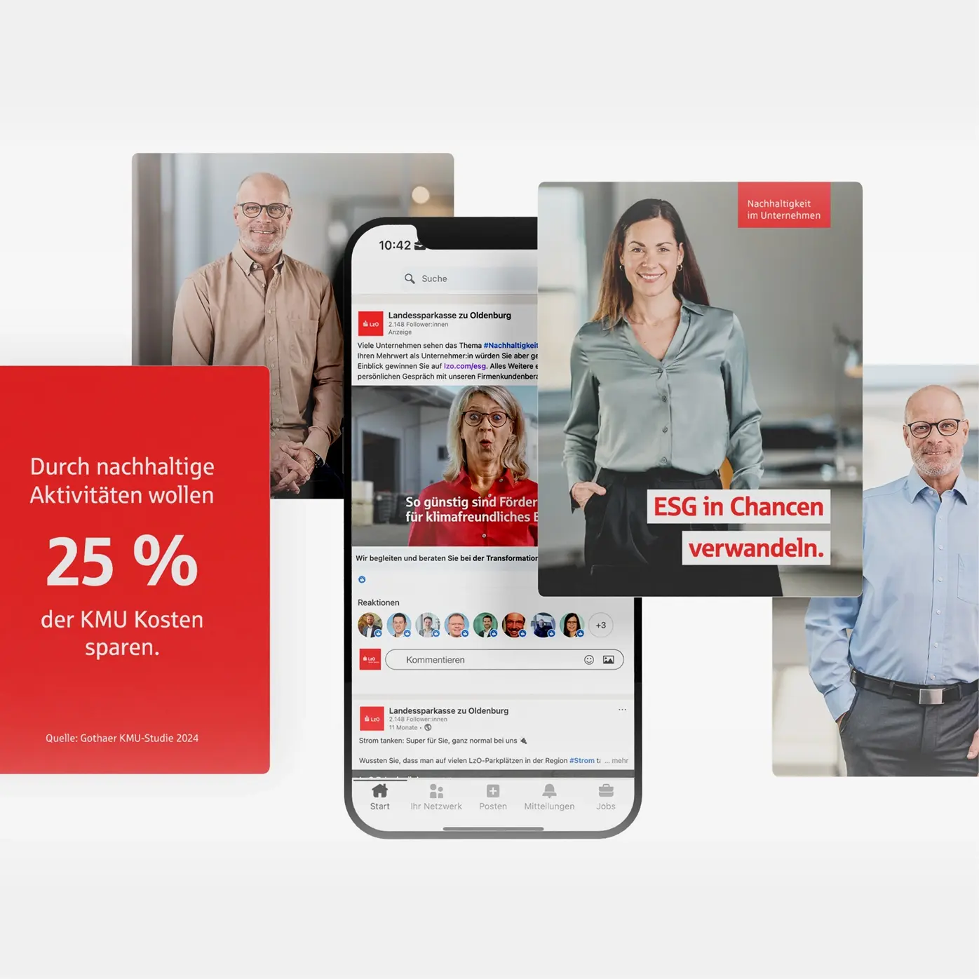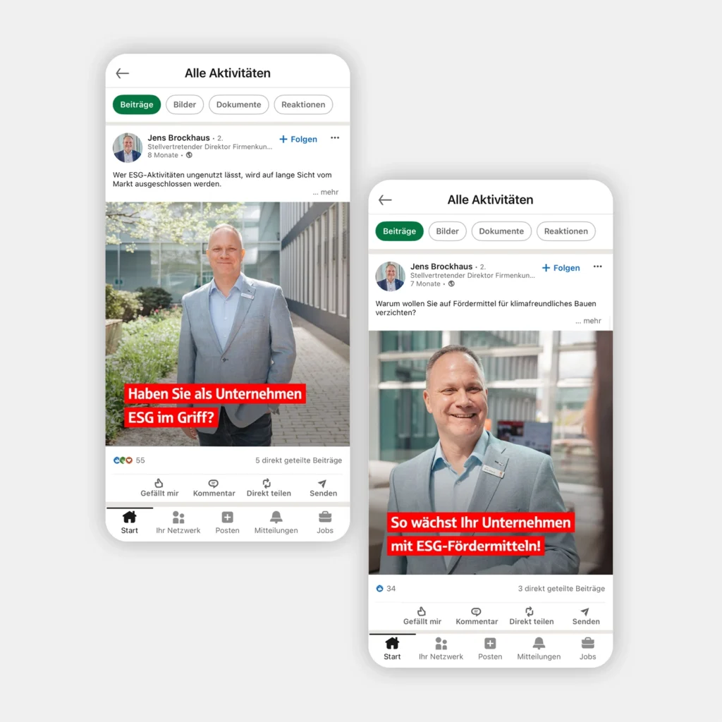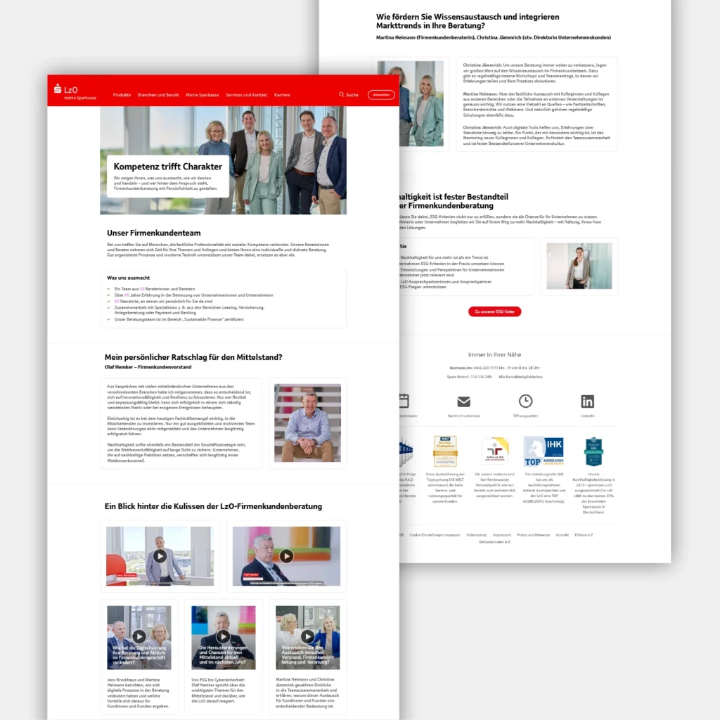 Gleichzeitig rücken wir die Menschen hinter dem Firmenkundengeschäft in den Mittelpunkt: Durch hochwertige Foto- und Video-Interviews mit Vorstand, Bereichsleitung und Beratungsteam schaffen wir Nähe und geben interne Einblicke. Die Porträts zeigen nicht nur fachliche Expertise, sondern ebenso die persönliche Motivation, Unternehmen in der Region partnerschaftlich zu begleiten. Die Videos werden sowohl auf der Website der LzO als auch auf LinkedIn und als Online-Kampagne eingesetzt.