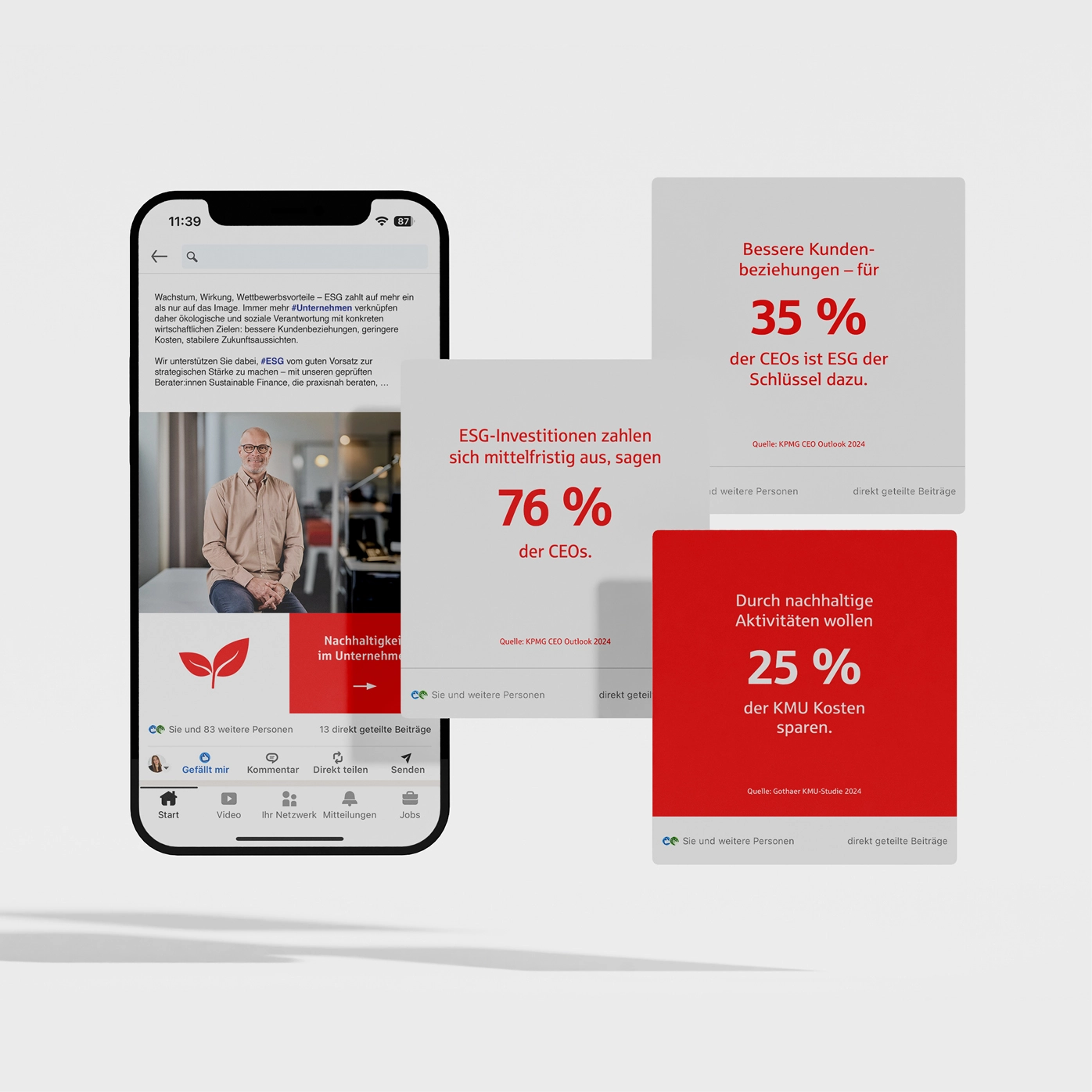 In einem gemeinsamen Workshop mit Führungskräften und Nachhaltigkeitsexperten der LzO haben wir die inhaltlichen Grundlagen für die ESG-Kommunikation erarbeitet. Nachdem die Kernthemen definiert und Zielgruppen geschärft wurden, haben wir ein Kommunikationskonzept entwickelt, das die unterschiedlichen Kanäle berücksichtigt. Der Schwerpunkt liegt auf crossmediale Formate, darunter die Filialausstattungen sowie Website, Social Media und Online-Kampagnen, die eine hohe Reichweite und direkte Ansprache ermöglichen. Ergänzend werden Print-Anzeigen eingesetzt, um die Botschaften auch im klassischen Umfeld sichtbar zu machen. Mit unseren Maßnahmen sensibilisieren wir für die wirtschaftlichen Chancen nachhaltigen Handelns, liefern fundierte Fakten und geben praxisnahe Impulse für ESG-Anwendungen im unternehmerischen Alltag.
