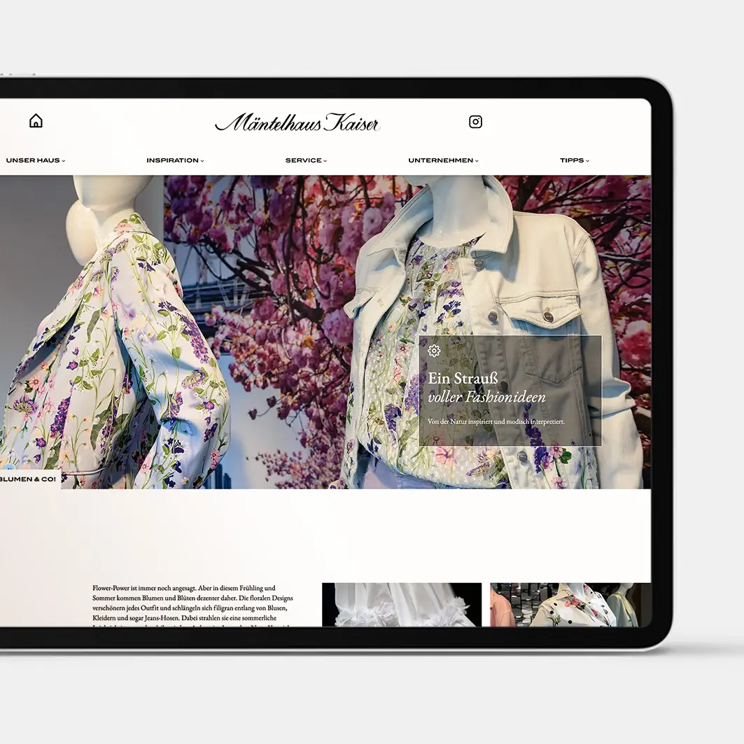 macht. Die Website ist Informationsplattform und zugleich digitales Schaufenster, das die Modewelten von Mäntelhaus Kaiser eindrucksvoll in Szene setzt.