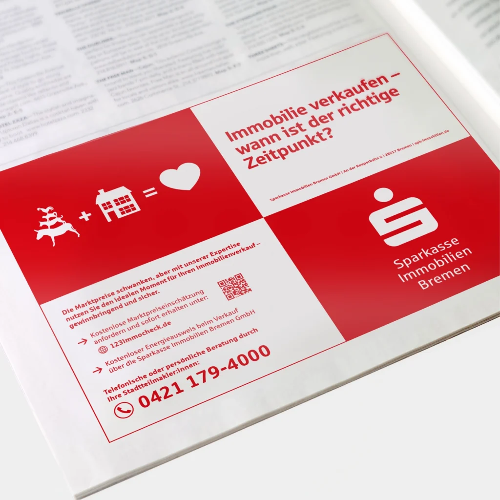 Was als Zusammenarbeit mit der LBS Immobilien Bremen begann, führen wir heute mit der Sparkasse Immobilien Bremen erfolgreich fort. Seit 27 Jahren begleiten wir den Markenauftritt, haben ihn konsequent modernisiert und auf die sich wandelnden Wettbewerbs- und Kundenanforderungen abgestimmt. Zum Einsatz kommen Corporate-, Print- und Online-Maßnahmen, B2B-Social-Media-Marketing sowie flächendeckende und crossmediale Stadtteilmakler-Kampagnen.